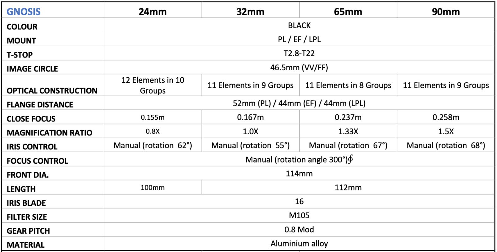 The Gnosis Micro line comprises four lenses with T2.8 apertures: 24mm, 32mm, 65mm, and 90mm. They offer a range of image reproduction ratios of 0.8:1, 1:1, 1.33:1, and 1.5:1 with edge-to-edge focus, delivering exceptional clarity and detail, even at macro distances, while boasting naturally soft bokeh for that coveted cinematic look.