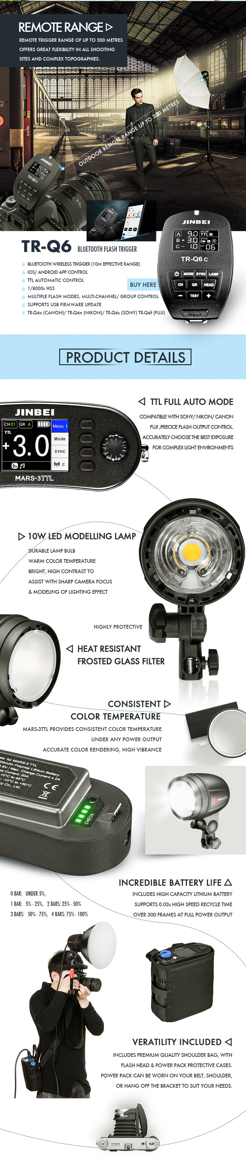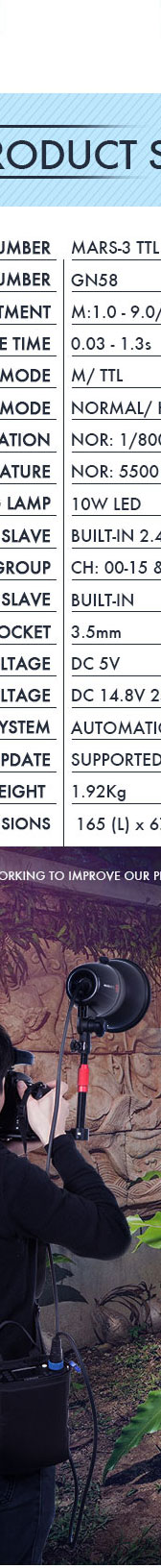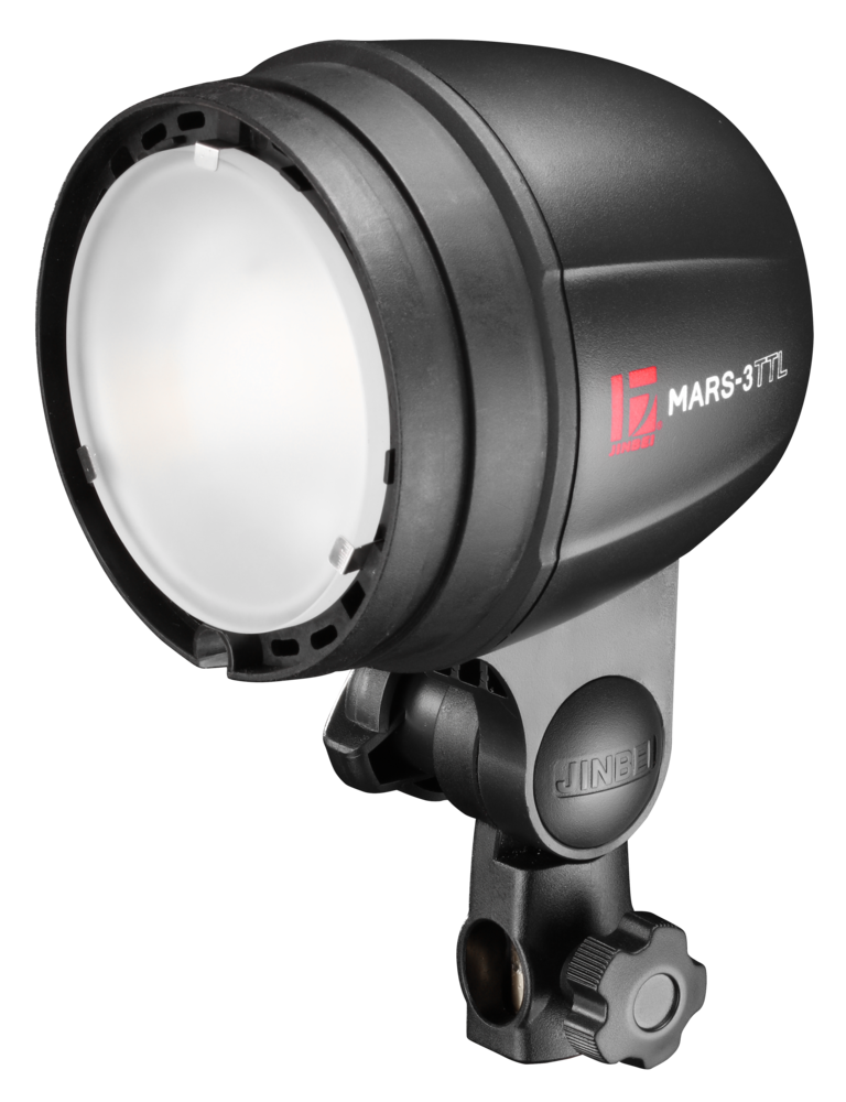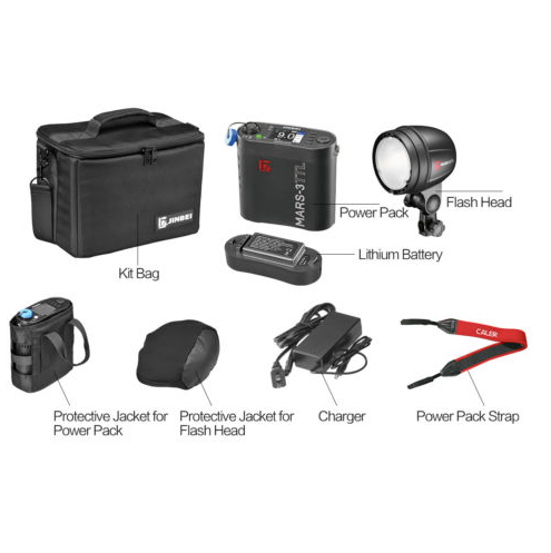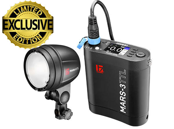 Jinbei Mars 3, the exciing new HSS TTL super Micro Camera Flash system. Incredibly light weight with a head that only weighs 300 grams and a base unit that weighs 1700 grams. Recycle of 0.3 - 1.3 seconds for fast shooting, 250 Watt output means only 1 stop less than a HD610. Freeze mode up to 1/19000 of a second and a frame rate that offers up to 20 Frames per second. 10 watt LED modeling lamp. TTL for Canon, Sony, Nikon, and Fuji, or shoot in full Manual mode. The Mars offers industry best features and far out-performs a speedlight in power and light quality.