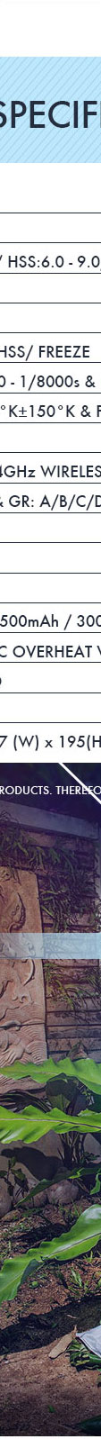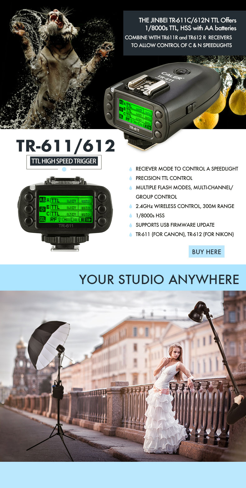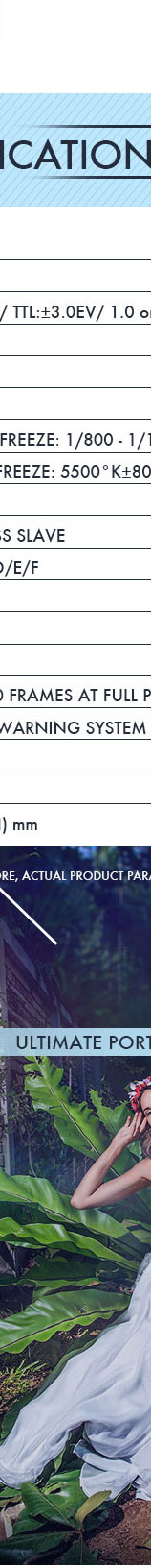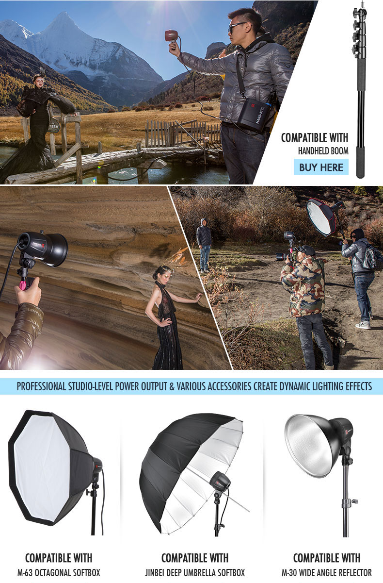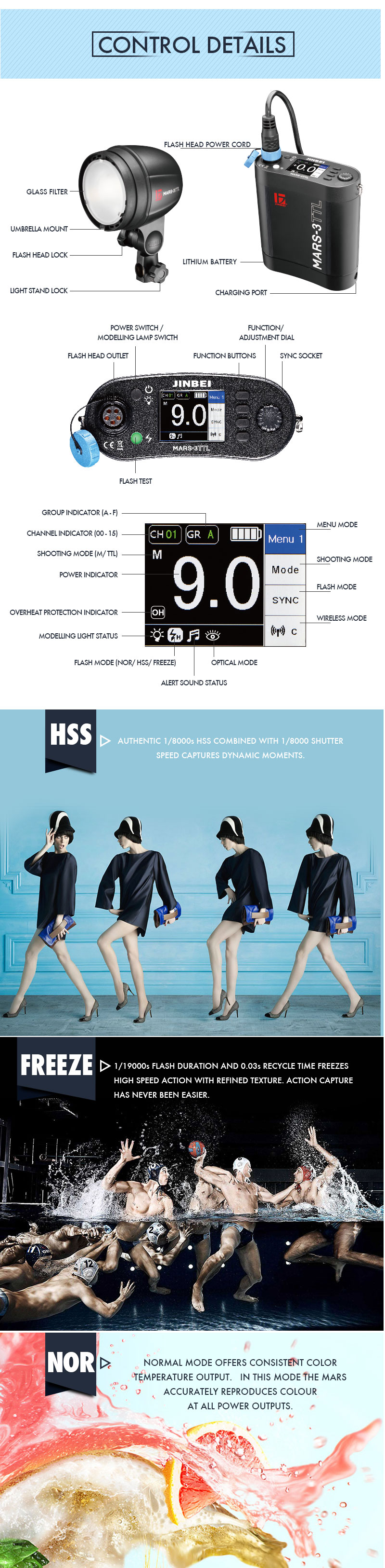 Jinbei Mars 3, the exciing new HSS TTL super Micro Camera Flash system. Incredibly light weight with a head that only weighs 300 grams and a base unit that weighs 1700 grams. Recycle of 0.3 - 1.3 seconds for fast shooting, 250 Watt output means only 1 stop less than a HD610. Freeze mode up to 1/19000 of a second and a frame rate that offers up to 20 Frames per second. 10 watt LED modeling lamp. TTL for Canon, Sony, Nikon, and Fuji, or shoot in full Manual mode. The Mars offers industry best features and far out-performs a speedlight in power and light quality.
