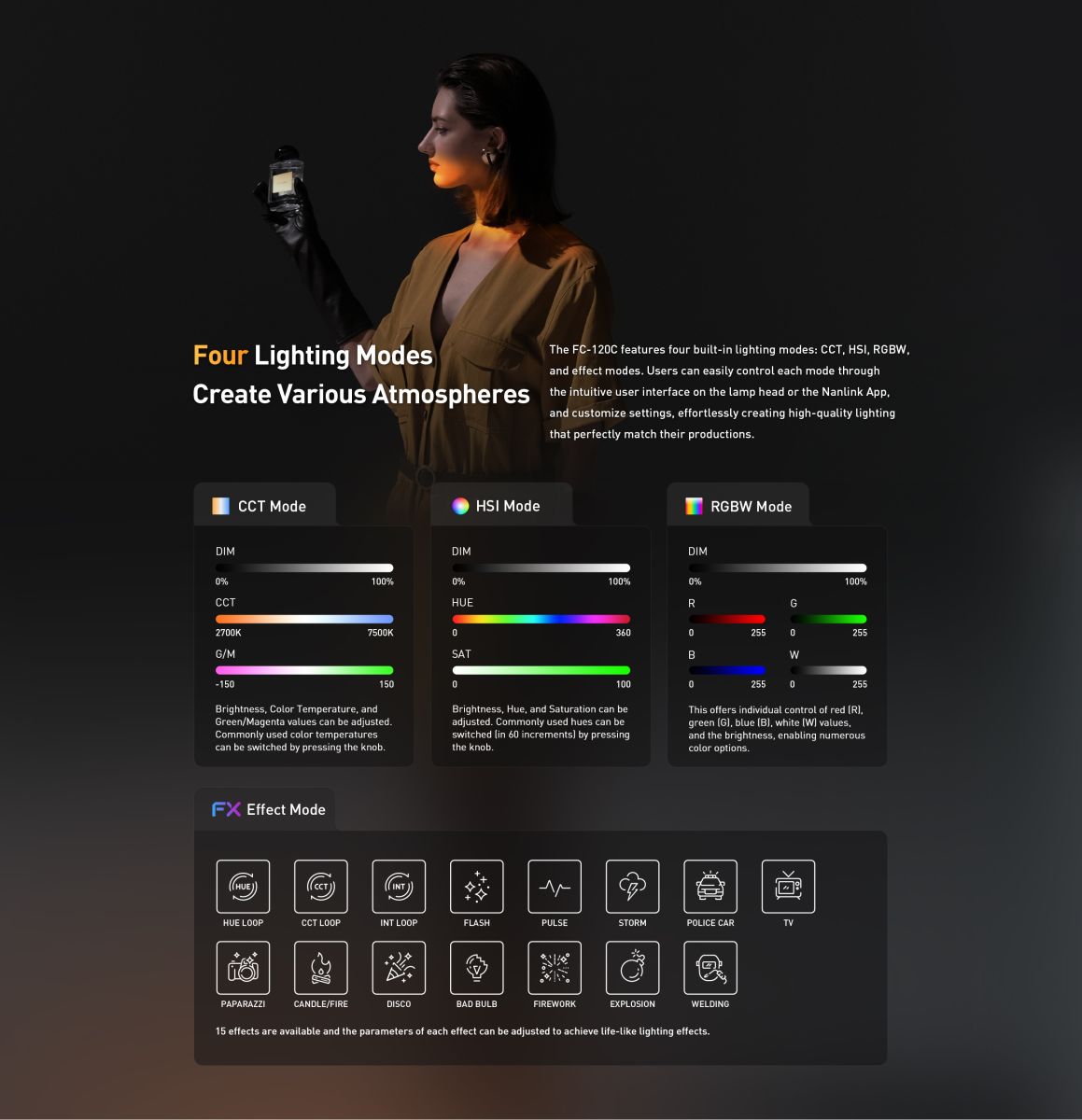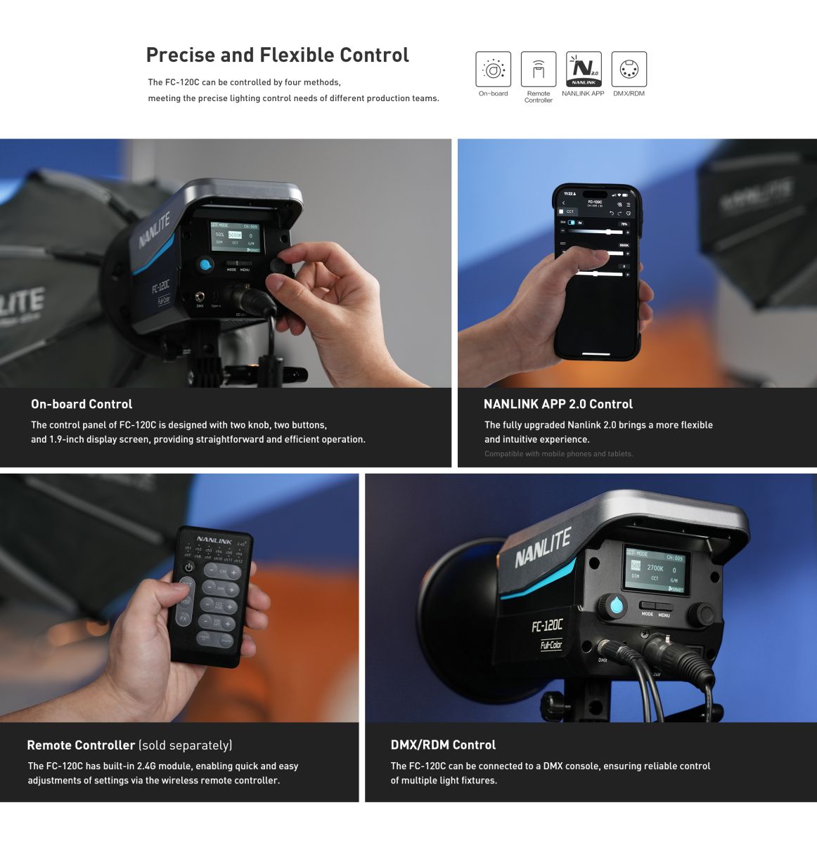 Control is flexible with onboard controls, remote control, the NANLINK app, or DMX/RDM, ensuring a seamless workflow. It offers three power options: an AC adapter, a V-mount battery, or a PD3.1 source, providing unmatched adaptability in any setting.